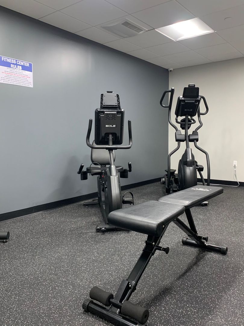 Patio on the river with fire pit and heaters together with a gym for tenant use.