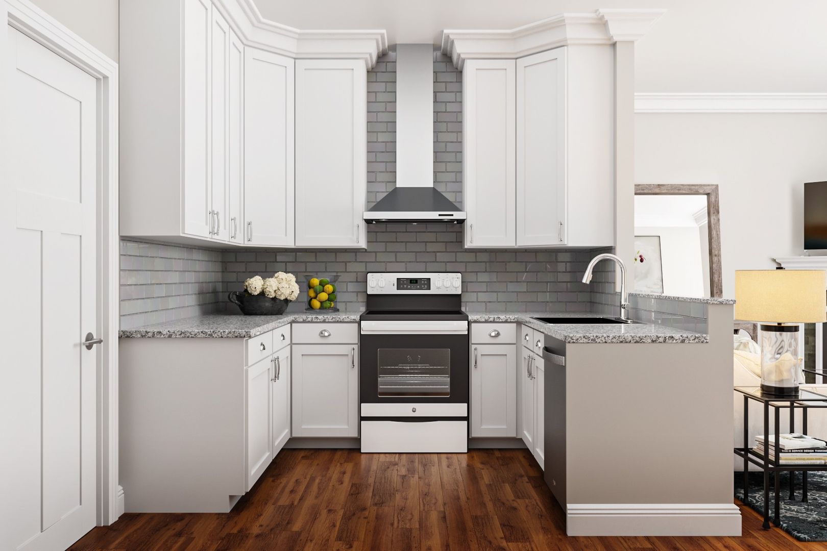 • Oversized island kitchens with custom hardwood Shaker-style cabinetry and stylish granite countertops with under mount stainless steel sinks